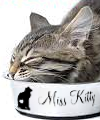 L’assiette creuse en céramique pour chat est décorée de pattes noires dessinées et d’un chat au centre, offrant une vaisselle élégante, stable et pratique pour les repas quotidiens.