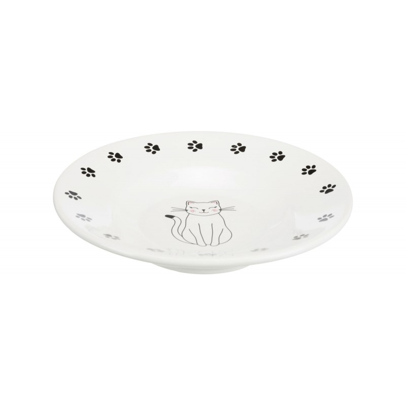 L’assiette creuse en céramique pour chat est décorée de pattes noires dessinées et d’un chat au centre, offrant une vaisselle élégante, stable et pratique pour les repas quotidiens.