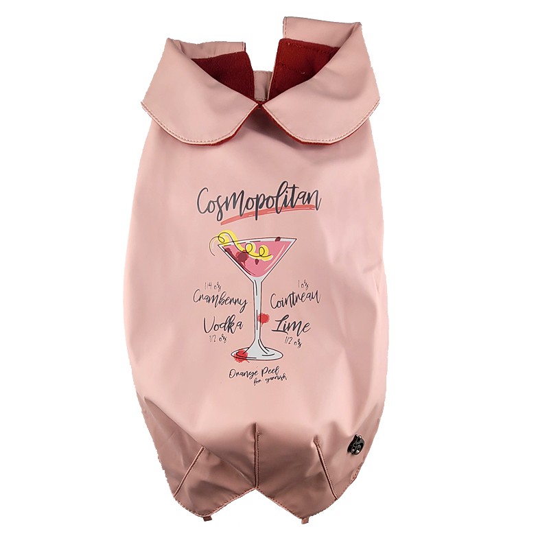 Protégez votre chien avec style grâce à cet imperméable « Cosmopolitan ». Sans capuche, il possède un petit col raffiné et deux boucles réglables pour un ajustement parfait sous le ventre. Sa doublure rouge offre confort et chaleur, tandis que le motif imprimé du célèbre cocktail Cosmopolitan sur le dos apporte une touche originale et chic.